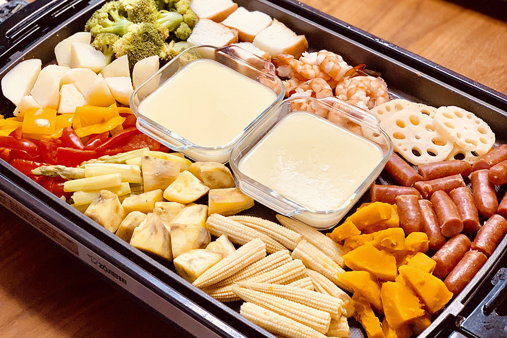 おうちBBQで試して好評だったホットプレートを使ったチーズフォンデュの紹介です。オリジナル鶏ウィンナーを使用しました。