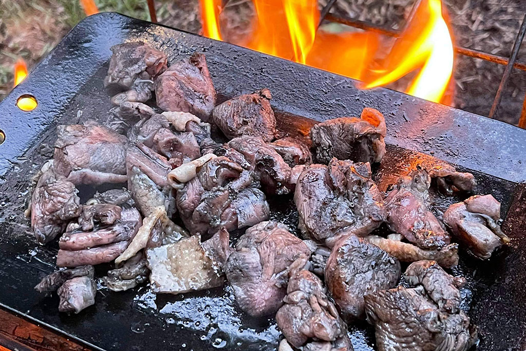 余計な調味料はいりません。写真のようにお肉が輝きを帯びてきた瞬間が食べ頃です。噛めば噛む程味わい深い。冷たいビールや焼酎と一緒にお召し上がり下さい。