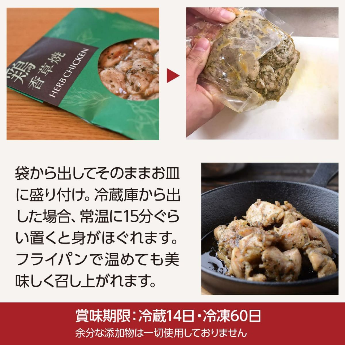 鶏香草焼の旨さは上品な香草をミックスしたスパイスにあります。フライパンで軽く温めて頂くと鶏香草焼の香りがより引き立ちます。鶏香草焼の繊細な味わいが魅力の人気商品です。
