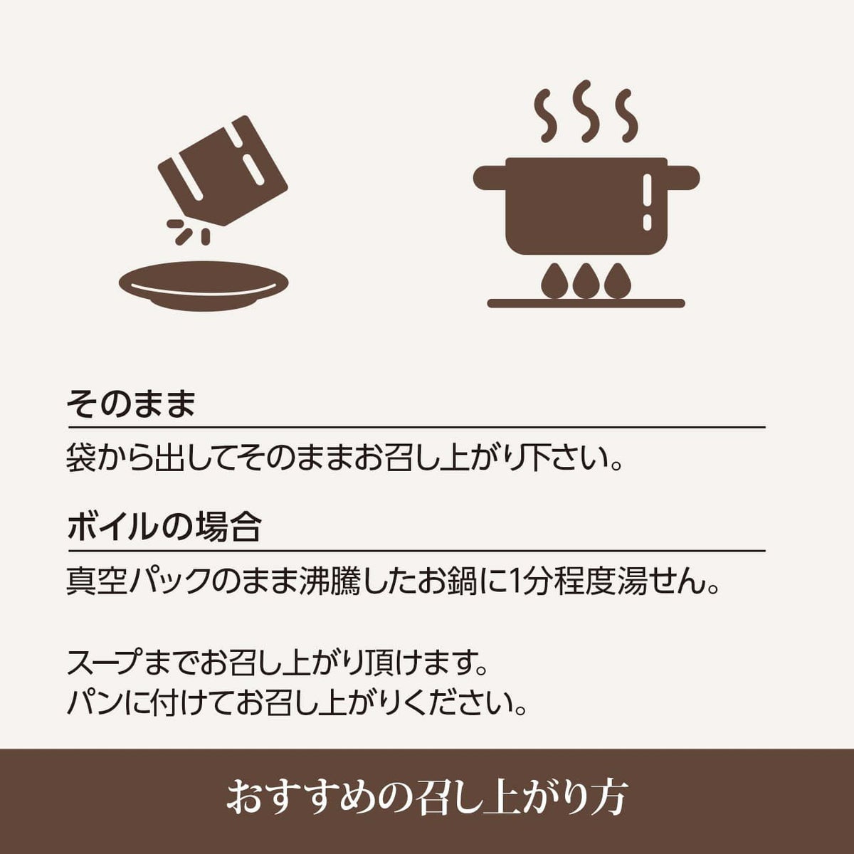 袋から出してそのままお召し上がり頂いても構いませんが、湯煎して温めて頂くとスープのスモークが引き立ち美味しく頂くことができます。パンなどに付けてお召し上がり下さい。長時間オイルで煮込んでいる為、程よい食感になっています。