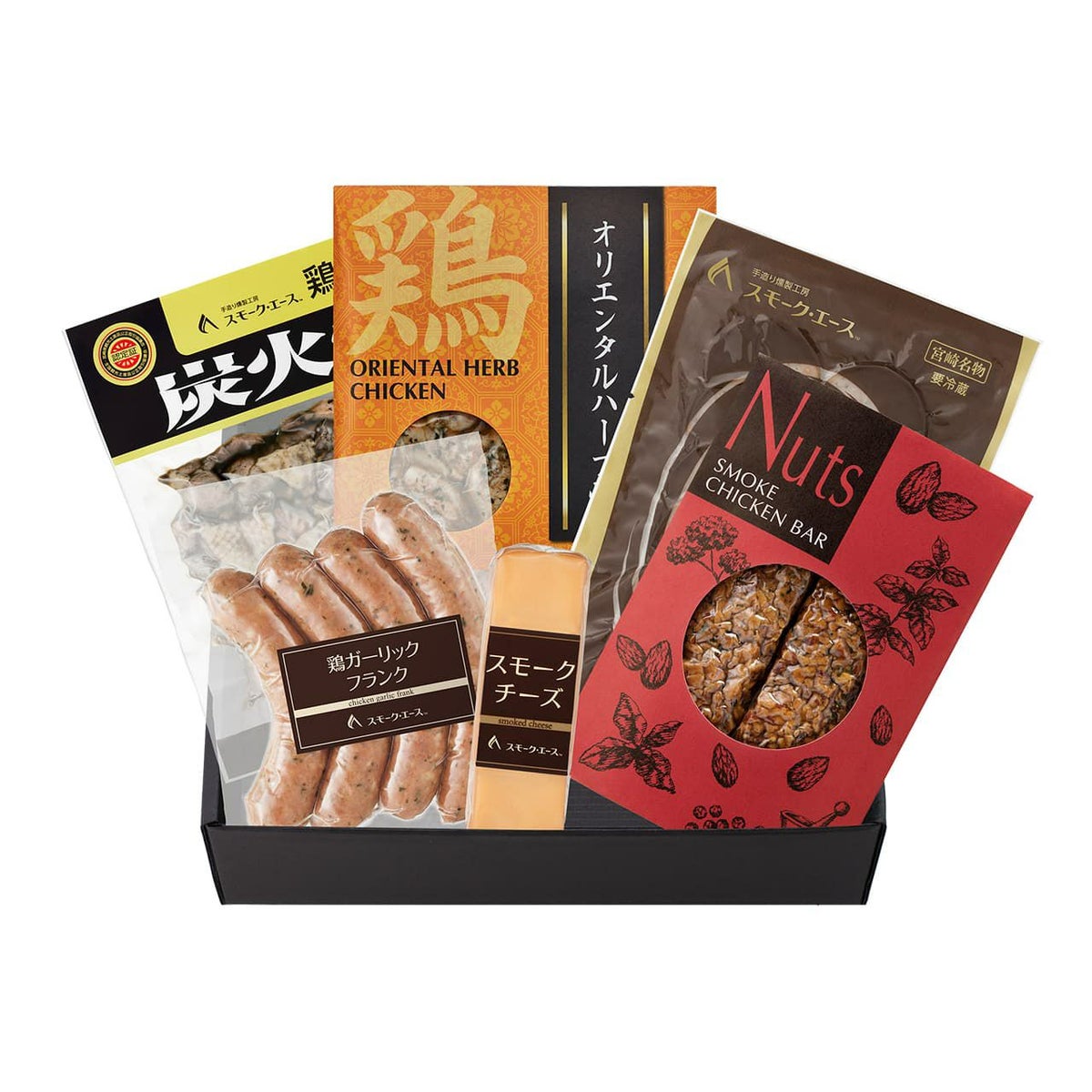 Nutsスモークチキンバーや鶏炭火焼、オリエンタルハーブ焼など個性的な製品を詰め合わせました。大切な方へのギフトをオリジナルラッピングでお届けします。熨斗、メッセージにも対応します。