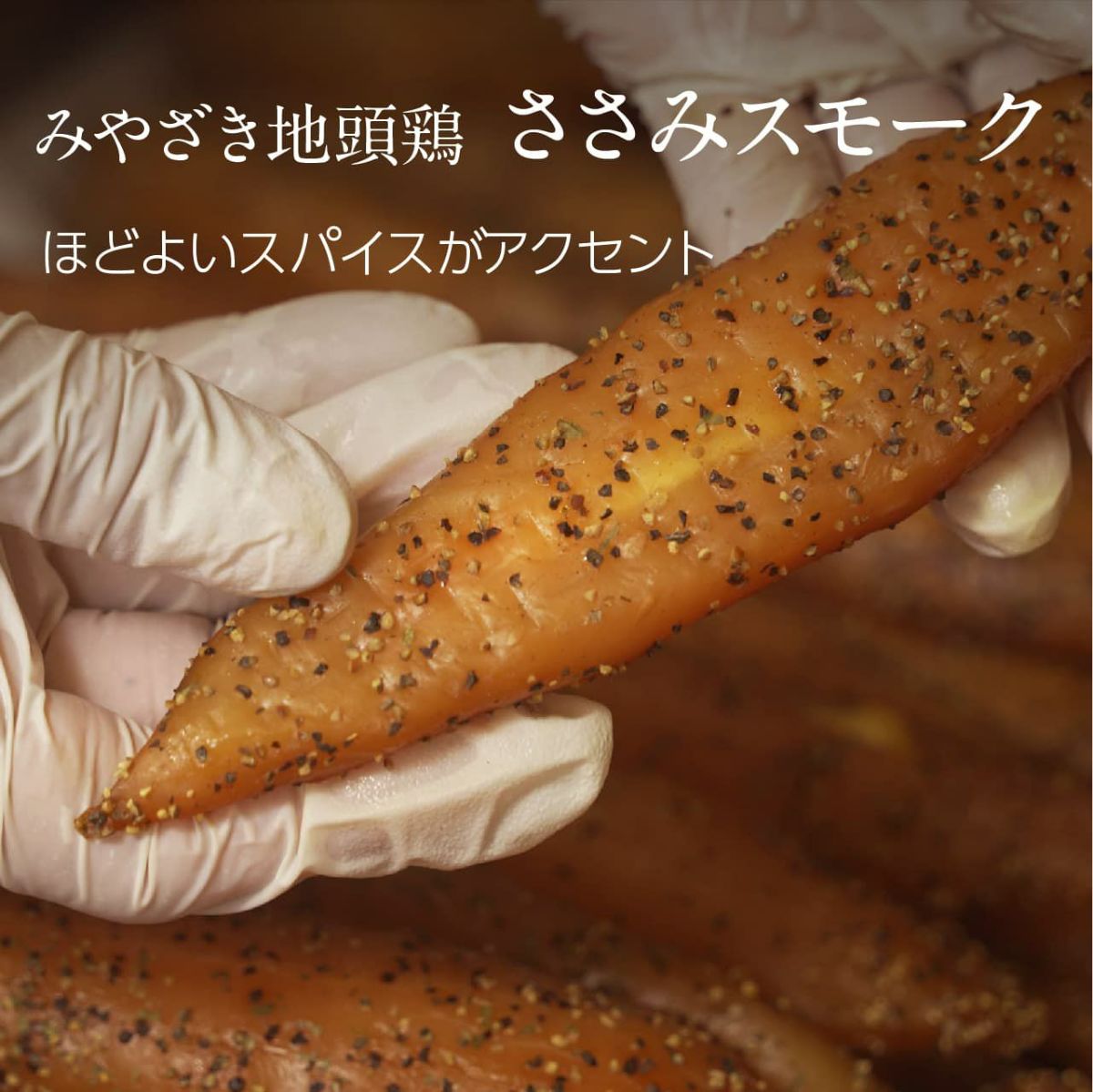 宮崎地鶏ささみくんせいの製法は他のみやざき地頭鶏製品の製法と基本は同じです。ピリ辛のスパイスは宮崎地鶏ささみくんせいの淡白さを補うために程よく、雪の降るようにという表現で粉しています。宮崎地鶏ささみくんせいは最後まで手作業で丁寧に出荷まで。全て自分達の手で行っています。