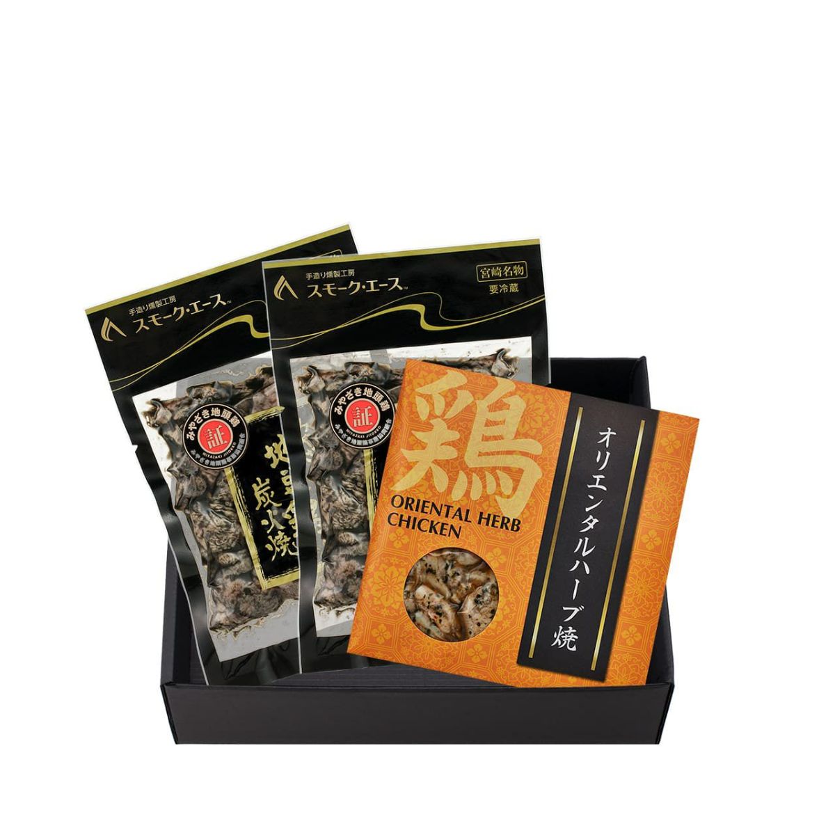 ブランド地鶏(みやざきじとっこ)を使用した宮崎地鶏炭火焼です。主に贈答用として購入される方が多い高級品です。契約農場が丁寧に育てた宮崎地鶏を贅沢に使用しています。鶏オリエンタルハーブ焼も個性的な美味しさが人気の製品です。