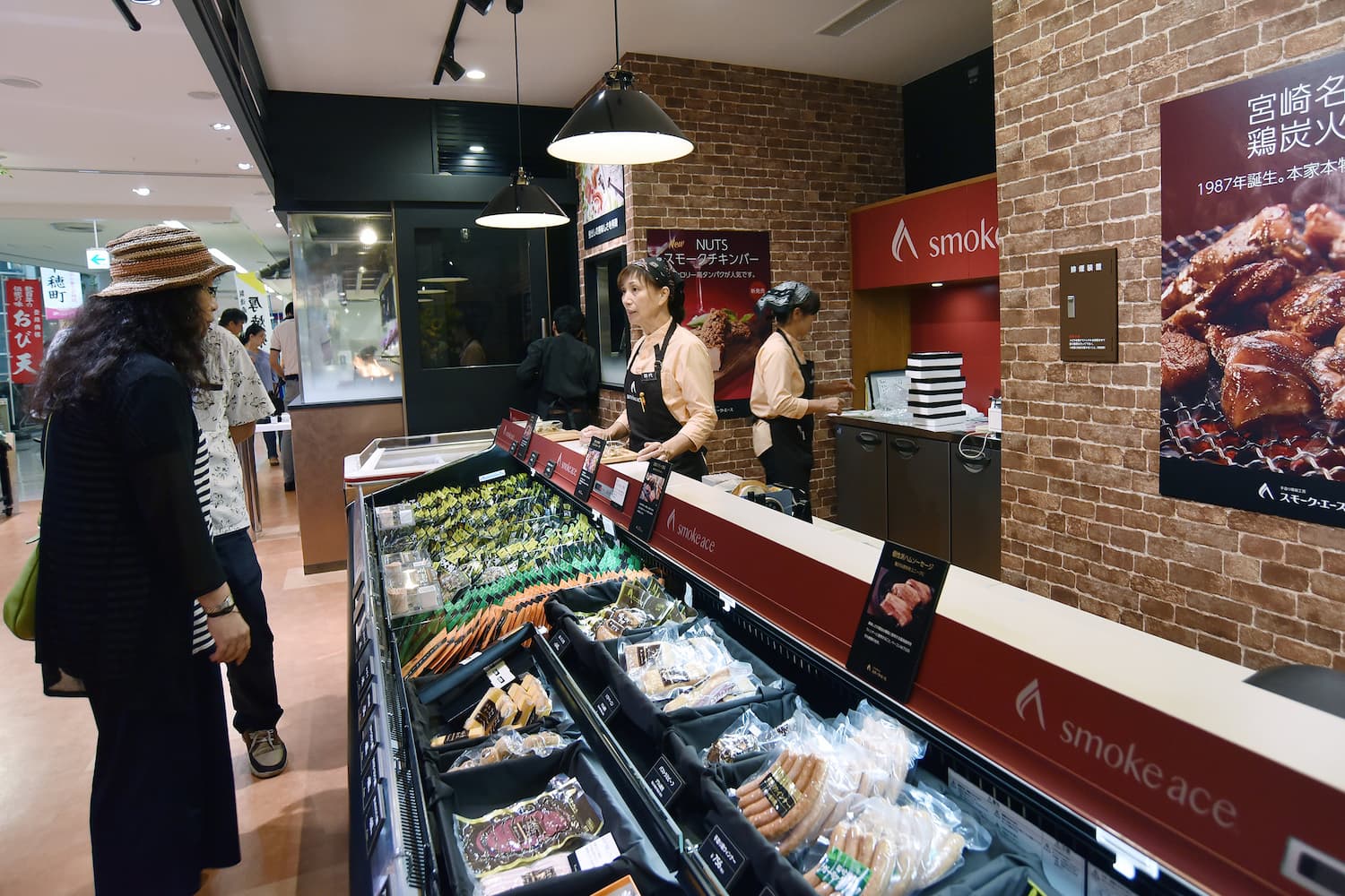 スモーク・エース宮崎空港直営店は宮崎県の空の玄関口、宮崎空港2Fにあります。年中無休で朝6:30から20:15まで営業しております(季節により変動あり)。 ガラス貼りの実演コーナーのあるレンガ壁のお店です。鶏炭火焼ののぼりを目印にお越しください。 鶏炭火焼などの実演販売(毎日午前午後各1回)もやっておりますので、お客様に美味しさを確認して頂きながら商品を選ぶことができます。実演した「鶏炭火焼レアー」をカップで購入することができ、出来立て熱々をお召し上がりいただけます。