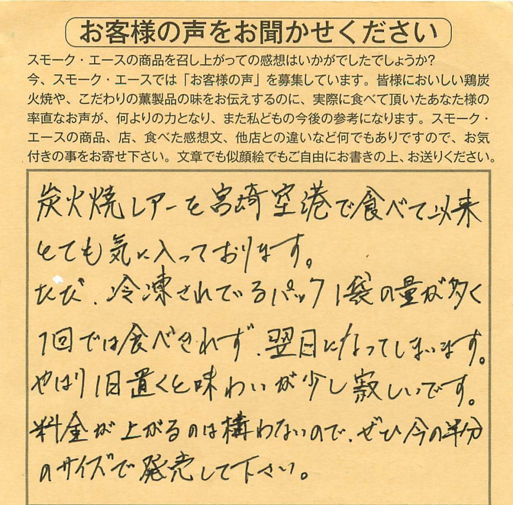 炭火焼レアーを宮崎空港で食べて以来 とても気に入っております。