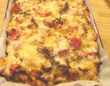 [6] [5]にとまとを加え、上にチーズ、パン粉、ローズマリーをのせ、200℃のオーブンで15分焼く。